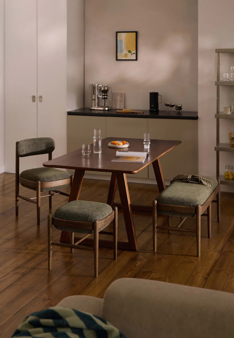 Naše retro kolekce IMARA – skládající se ze židle, stoličky a lavice – z masivního dubového dřeva rámuje měkké sedadlo výraznými liniemi a vytváří jemnou, elegantní siluetu.